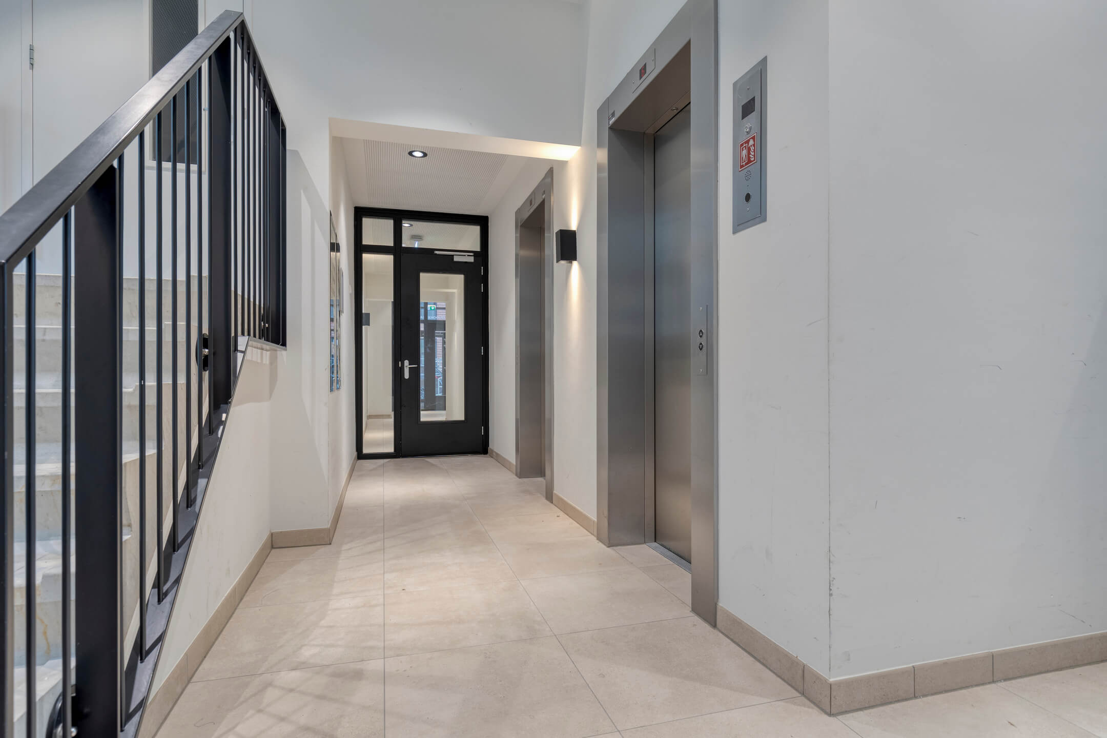 Op de begane grond bevindt zich de entree van het complex met toegang tot de brievenbussen, maar ook de gezamenlijke fietsenstalling en de bergingen. Er zijn twee liften en een trap. De prachtige zes meter hoge entree brengt je naar één van de twee liften die je naar de eerste etage brengt. Natuurlijk kun je ook de brede trap naar boven nemen.