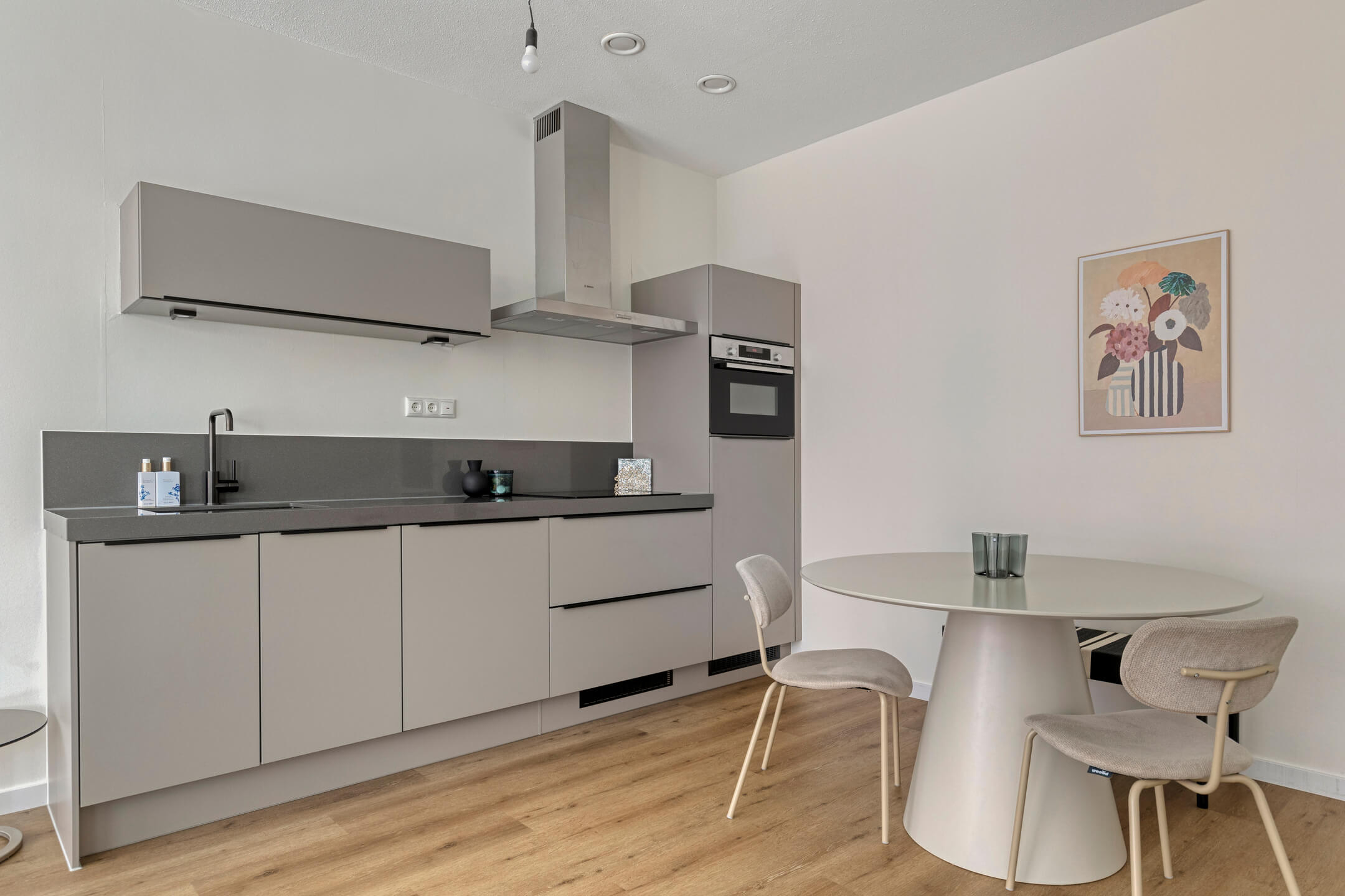 Entree van het appartement. Je stapt binnen in de L-vormige hal die toegang biedt tot het luxe toilet, de luxe badkamer, de ruime en lichte slaapkamer, de meterkast en de stookruimte. Verder is er een separate wasruimte die ook opbergruimte biedt. De woonkamer welke voorzien is van een gloednieuwe keuken is heerlijk licht door de grote ramen. Het balkon/loggia is gelegen op de ochtendzon. Een fijne plek voor een kopje koffie.