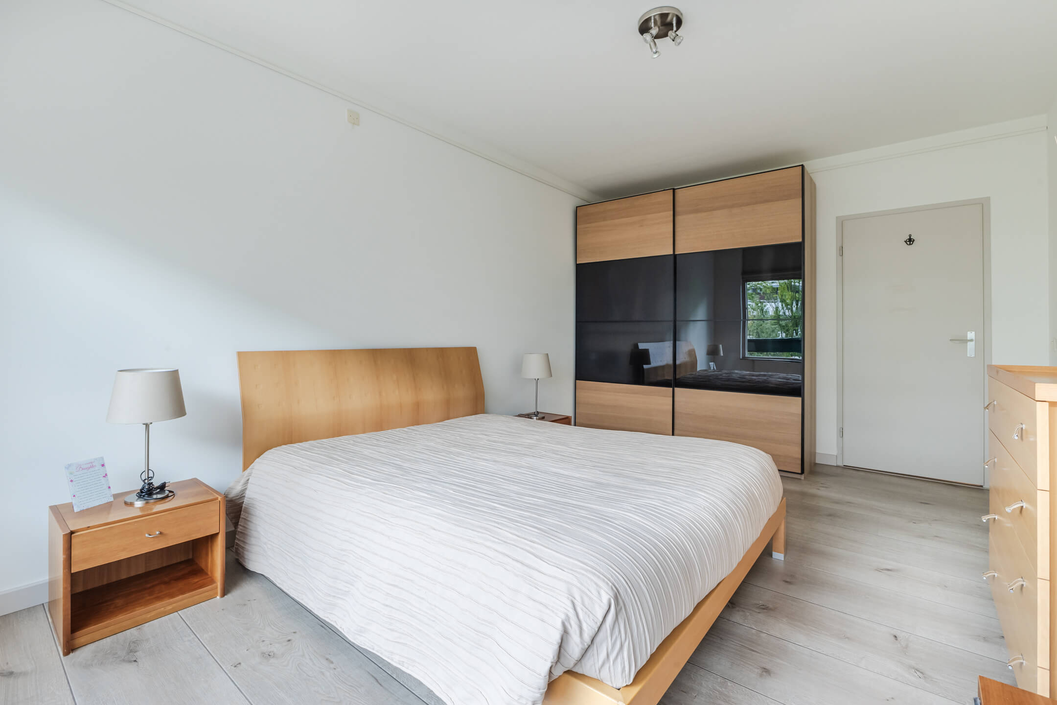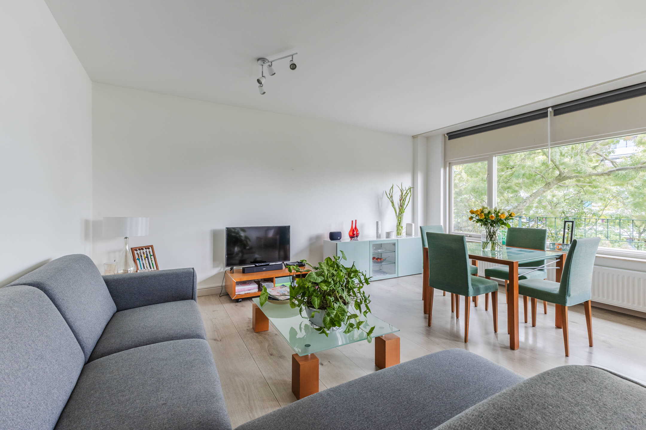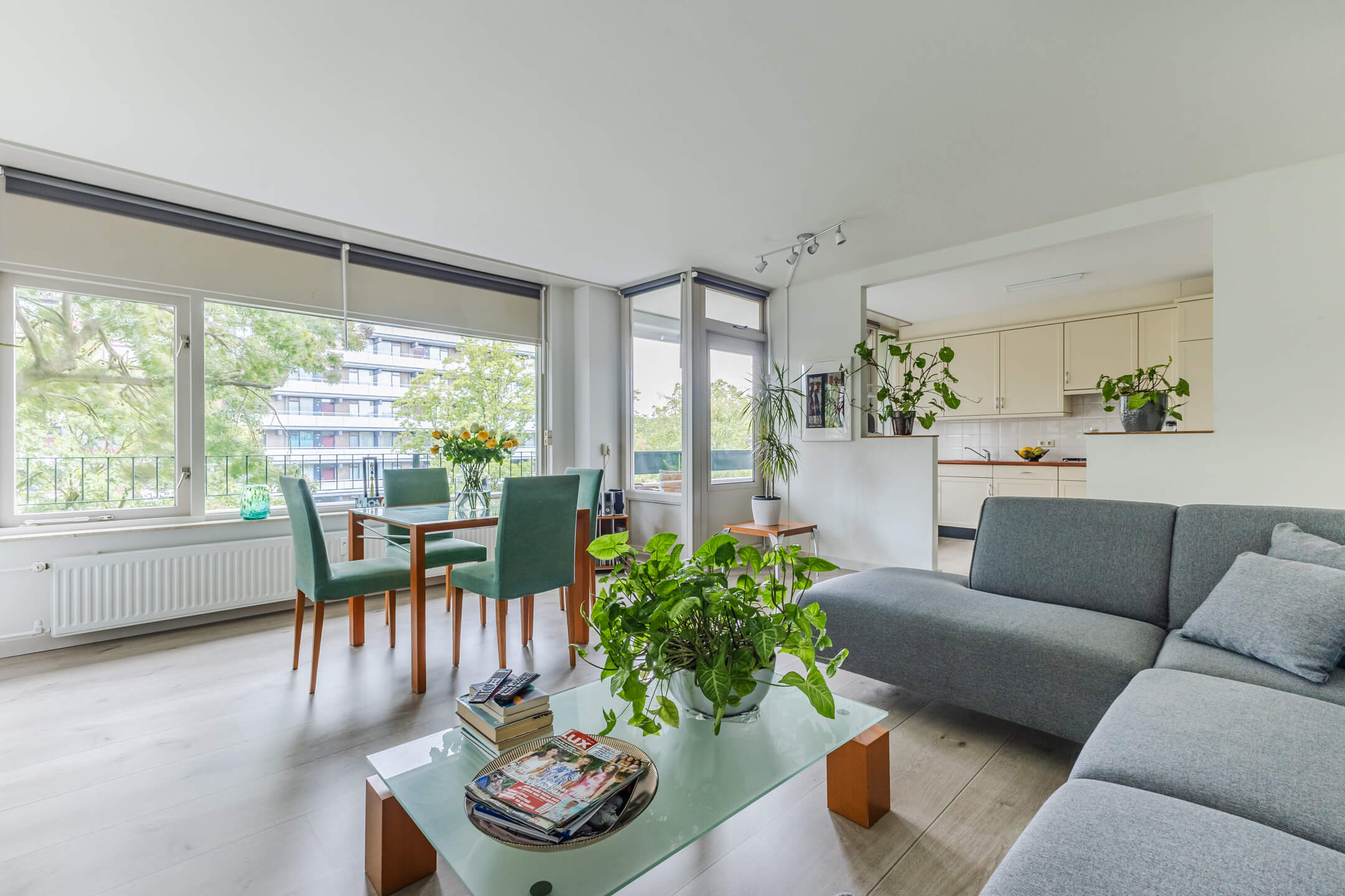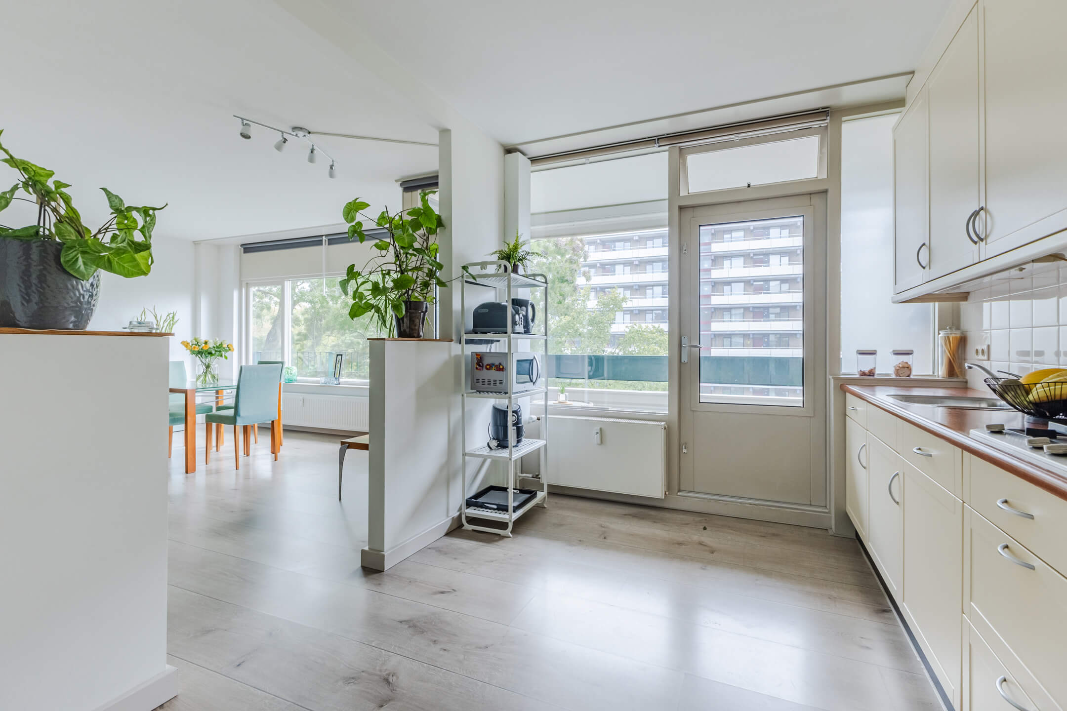 Je komt binnen via een ruime hal die alle vertrekken met elkaar verbindt. Aan de rechterkant vind je de nette badkamer met douche, ligbad, radiator en wastafel. De hoofdslaapkamer is ruim (ca. 18 m²!) en dankzij de hoekligging lekker licht. De woonkamer ligt op de hoek van het gebouw en heeft daardoor aan twee zijden ramen, dat merk je direct aan de lichtinval. De halfopen keuken is voorzien van inbouwapparatuur zoals een koel-/vriescombi, combi-oven, gaskookplaat en vaatwasser. Handig: in de bijkeuken is ruimte voor je wasmachine en droger. Verder is er nog een tweede slaapkamer én een separaat toilet.