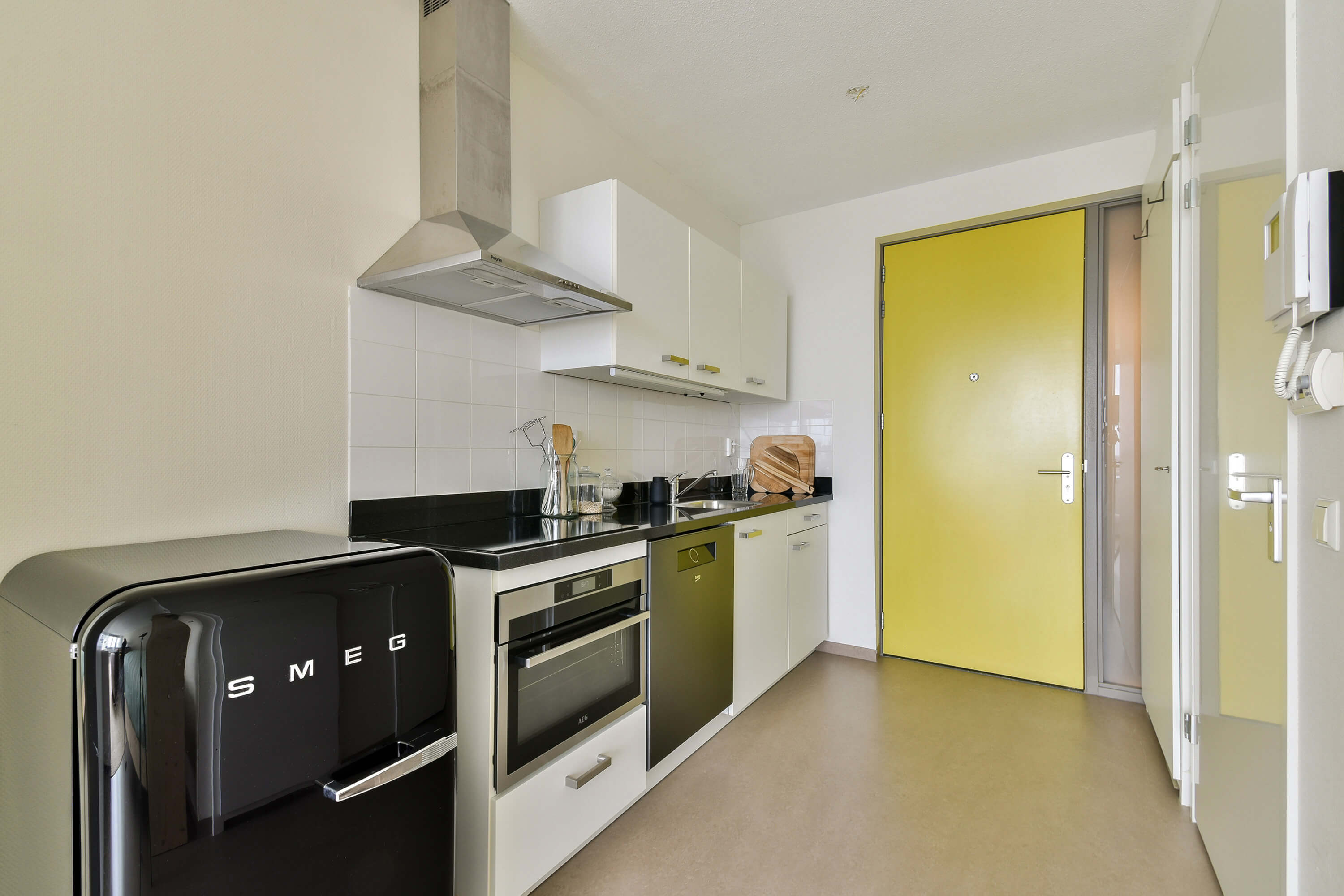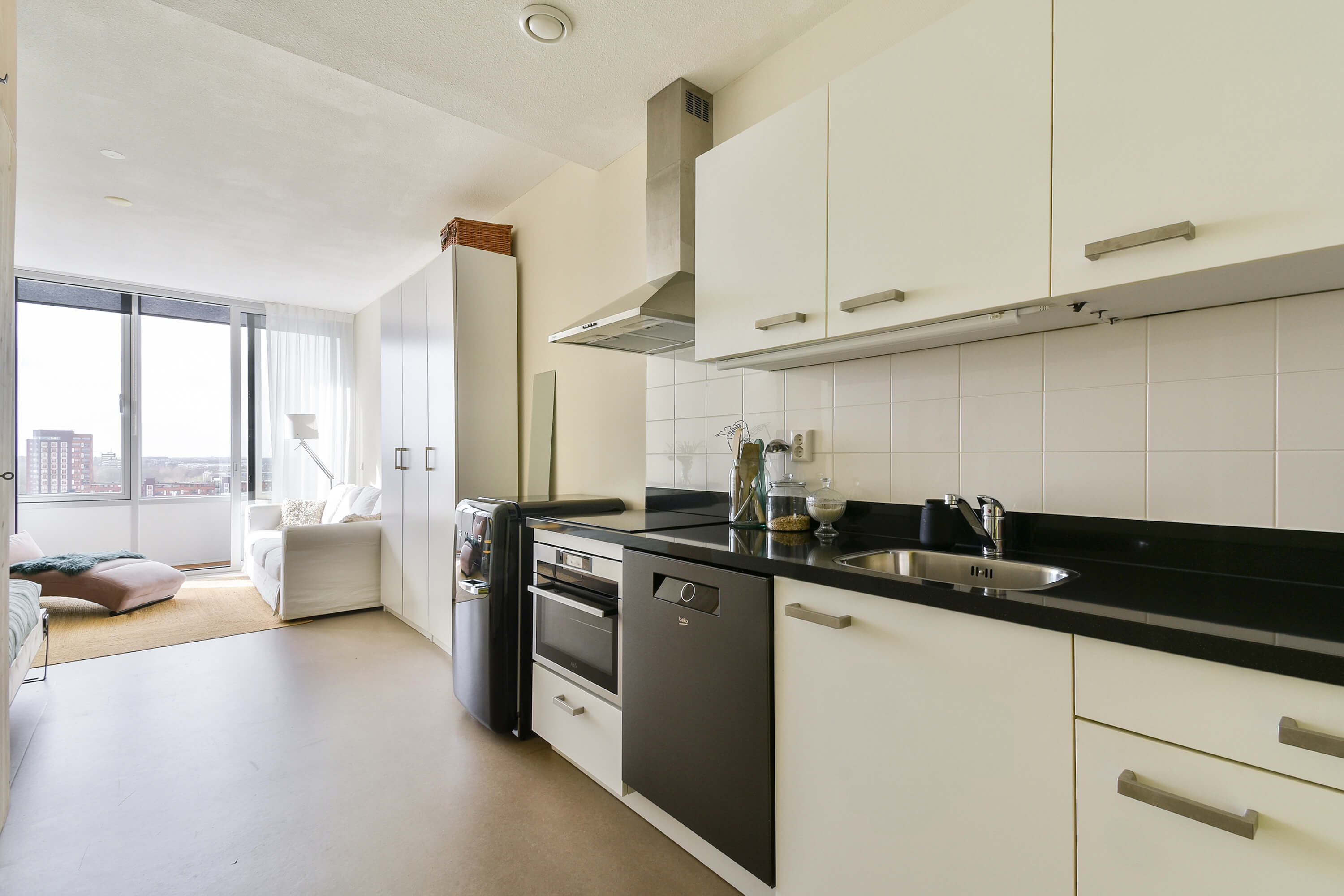 Via de centrale entree en de lift bereik je de 10e verdieping. Daar kom je door een met videofoon beveiligde deur en betreed je het eerste appartement aan je linkerhand. In de studio bevindt zich een open keuken die is voorzien van een vaatwasser, heteluchtoven, inductiekookplaat, afzuigkap en vrijstaande koelkast. De lichte woon-slaapkamer ligt aan de westzijde en heeft een serre die afgesloten kan worden met een handige schuifpui voor extra isolatie en die naast opbergruimte ook een comfortabele zitplek biedt. De verzorgde, betegelde badkamer heeft een douche, wastafel en zwevend toilet.