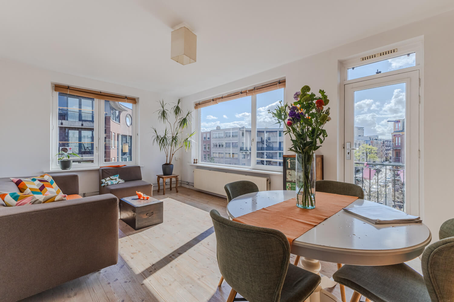 De woonkamer is de plek waar alles samenkomt. Zitten, eten, even naar buiten stappen. Vanaf hier loop je zo het balkon op aan de voorzijde, met uitzicht over het plein en de straat. Dit is zo’n plek waar je blijft hangen. Even zitten met koffie, of juist aan het eind van de dag nog een drankje terwijl de stad langzaam van kleur verandert.