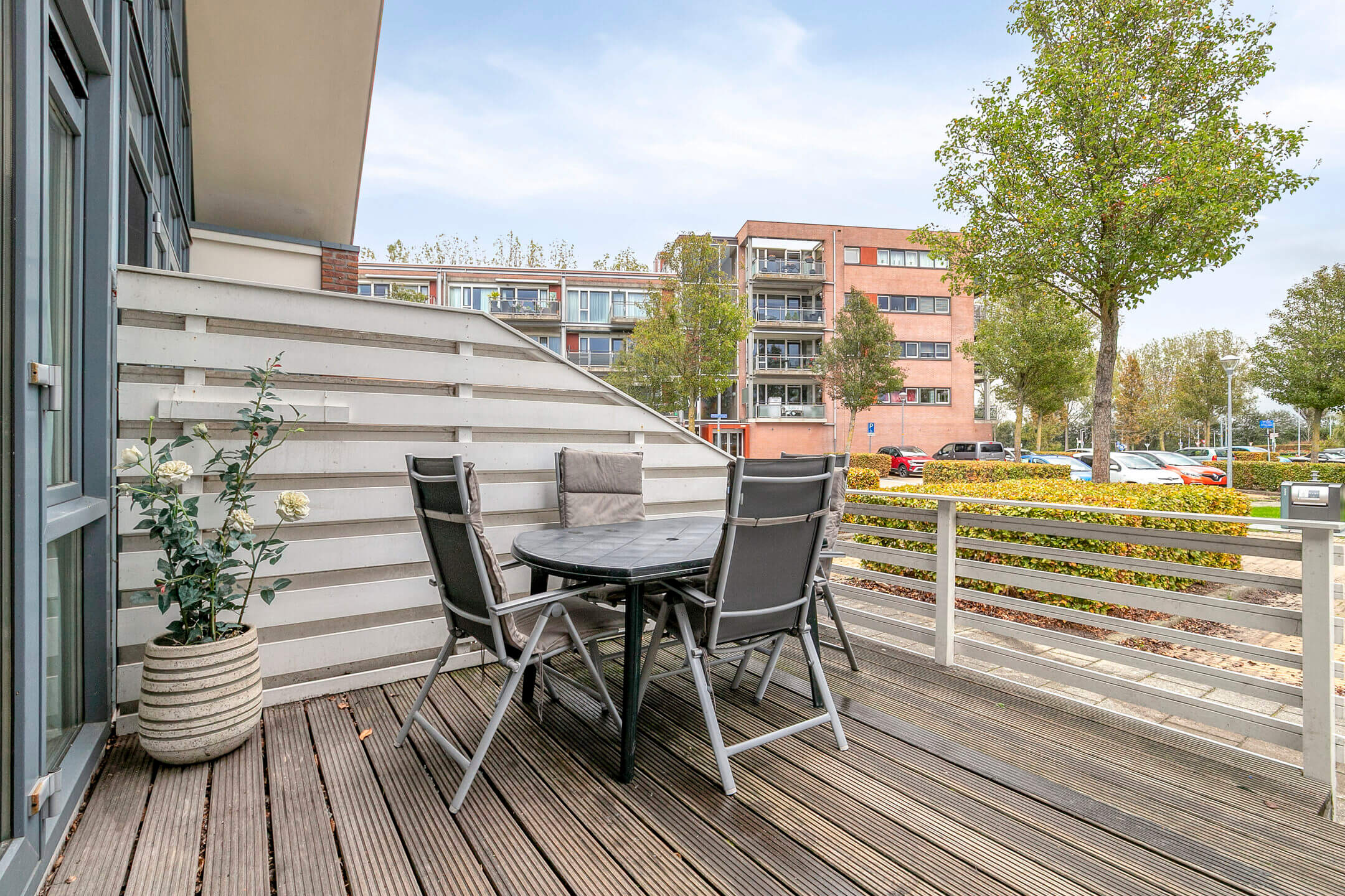 Via de ruime, gezellige veranda aan de voorzijde, een plek waar je heerlijk buiten kunt zitten in de ochtendzon of juist de dag afsluit met een kop koffie of een glas wijn kom je binnen in een verrassend ruime hal met meterkast en garderoberuimte.