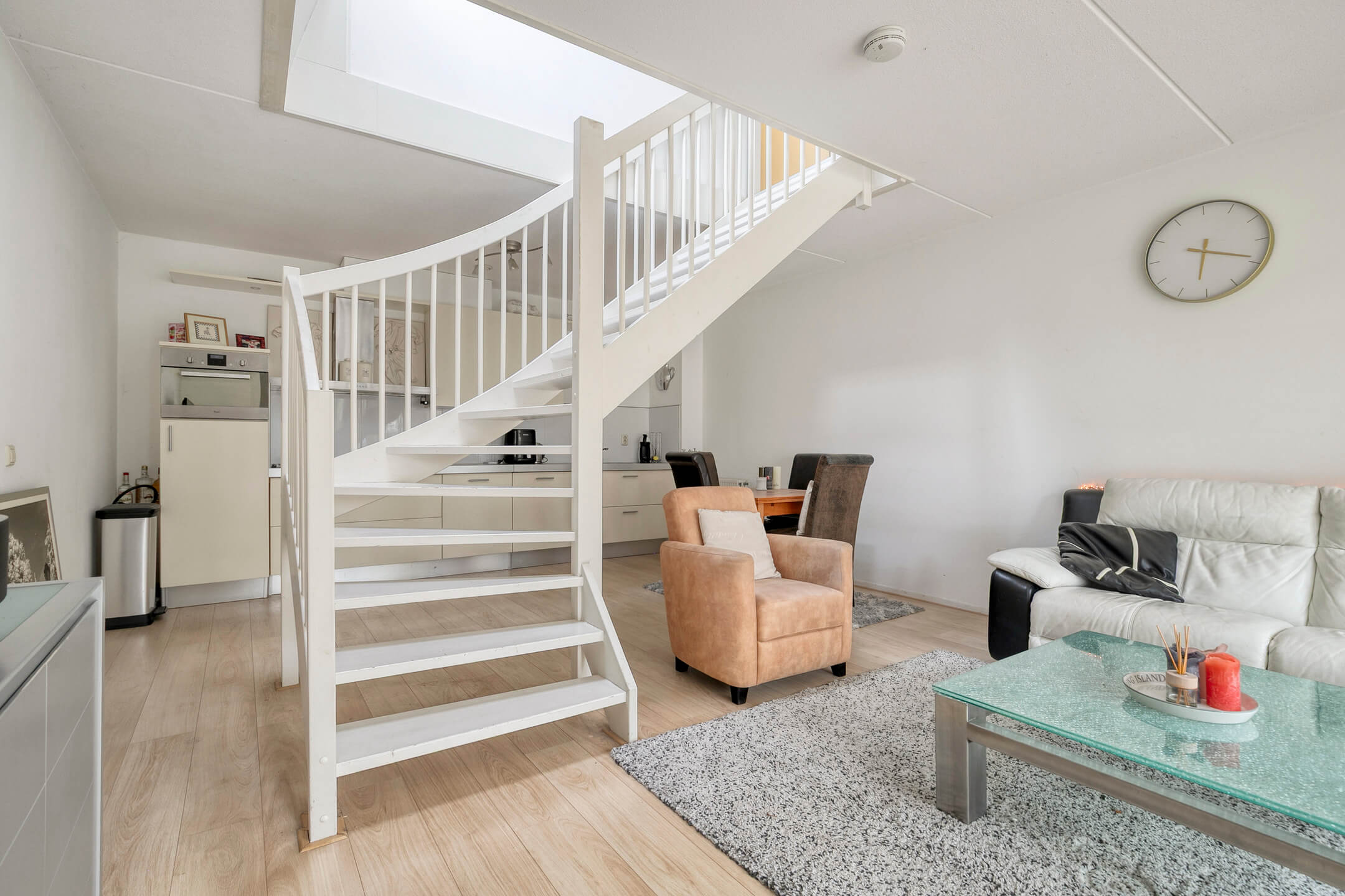 De woonkamer is licht en ruim, met een prettige indeling, grote raampartijen en dubbele openslaande deuren naar de veranda. Hierdoor vloeien binnen en buiten mooi in elkaar over. De open keuken is slim gesitueerd en laat zich makkelijk aanpassen aan je eigen woonwensen.